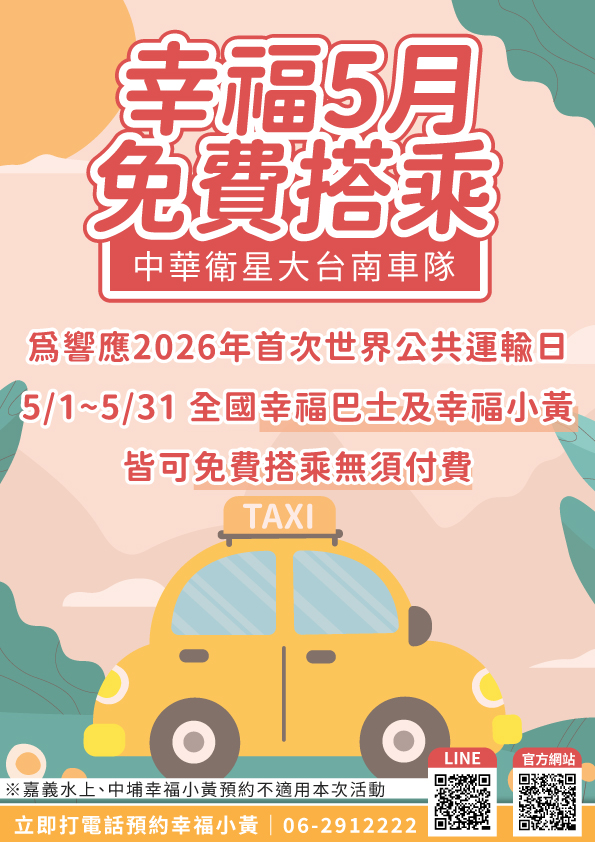 響應世界交通運輸日 全國2026年5月幸福巴士、小黃免費搭乘 相關推薦 2026.02.16-02.21黃5、黃20路線 配合下營區馬上發財年貨大街美食市集活動改道 29 1 月, 2026 嘉義縣中埔幸福小黃通車 翁章梁:串聯偏鄉就醫通學最後一哩路 31 3 月, 2026 水上幸福巴士/預約票價說明 22 1 月, 2025 發佈留言 取消回覆CommentEnter your name or username to comment Enter your email address to comment Enter your website URL (optional) 在瀏覽器中儲存顯示名稱、電子郵件地址及個人網站網址,以供下次發佈留言時使用。