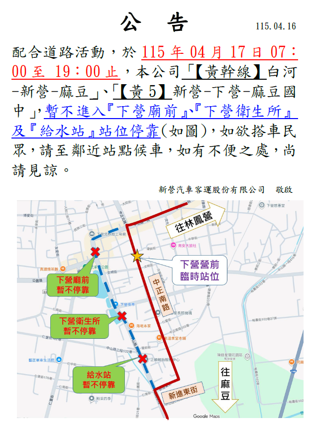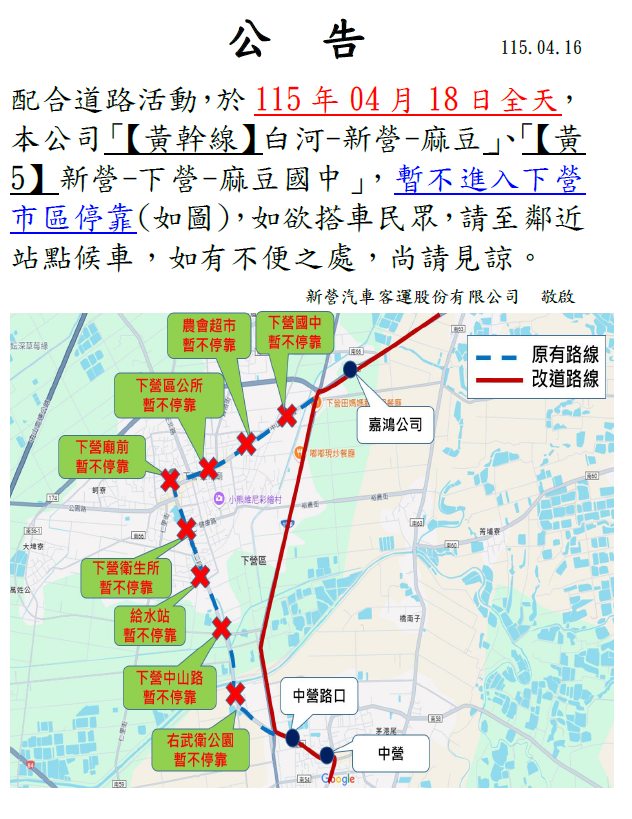 2026.04.17~04.18配合下營區繞境黃5、黃20改道 日期:2026.04.17、2026.04.18影響時間:請看附圖影響路線:黃5、黃20影響站點:請看附圖 Tags: 黃20, 黃5 Read more articles Previous Post2026.04.17、04.18土庫上帝廟出巡前往下營上帝廟路線影響 相關推薦 2026.04.17、04.18土庫上帝廟出巡前往下營上帝廟路線影響 8 4 月, 2026 計程車審驗SOP 8 10 月, 2024 114年4月2號至6號 清明連假客運優惠 26 3 月, 2025 發佈留言 取消回覆CommentEnter your name or username to comment Enter your email address to comment Enter your website URL (optional) 在瀏覽器中儲存顯示名稱、電子郵件地址及個人網站網址,以供下次發佈留言時使用。